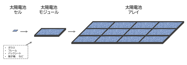 太陽電池はその構成により、いくつかの名称があります。最小単位の部品である「太陽電池セル」、セルを組み入れた製品の最小単位「太陽電池モジュール」、モジュールを接続し組み合わせた「太陽電池アレイ」、アレイと関連機器を組み合わせた「太陽光発電システム」という名称があります。※セルの形状が正方形ではないもの、最小単位の部品がそのまま製品であるものもあります。