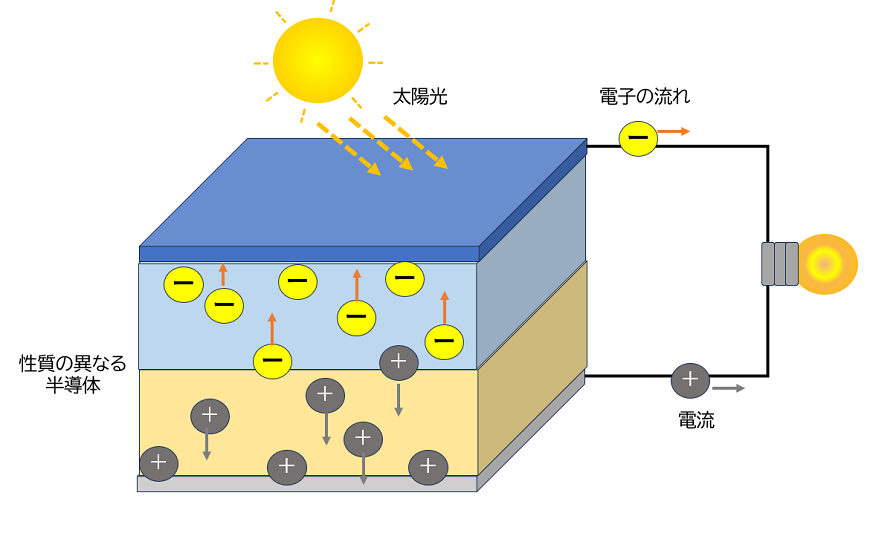 太陽電池は光電効果(photoelectric effect)により照射された光エネルギーを直接電気エネルギーに変換する素子です。シリコンや化合物などの半導体で作られています。